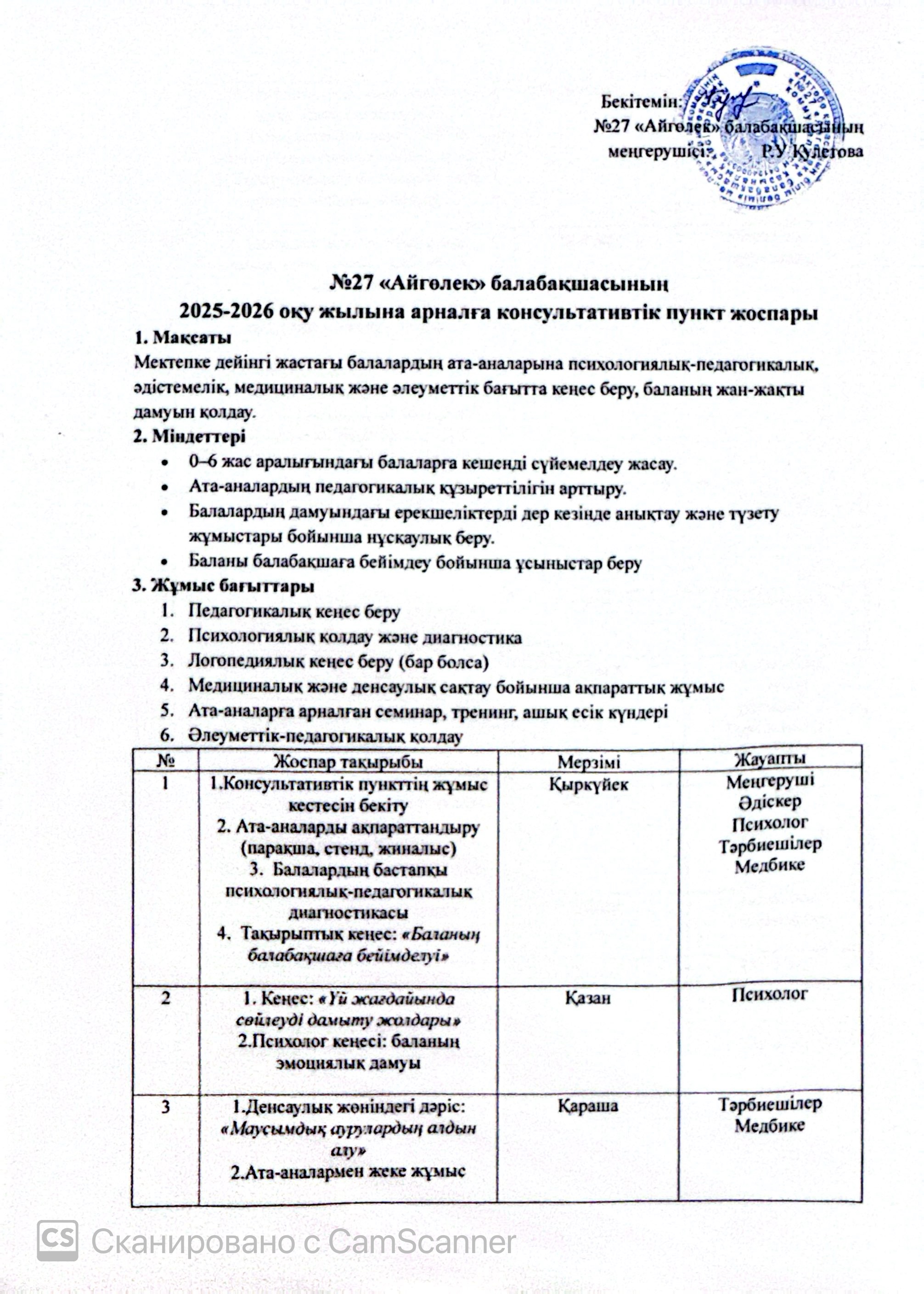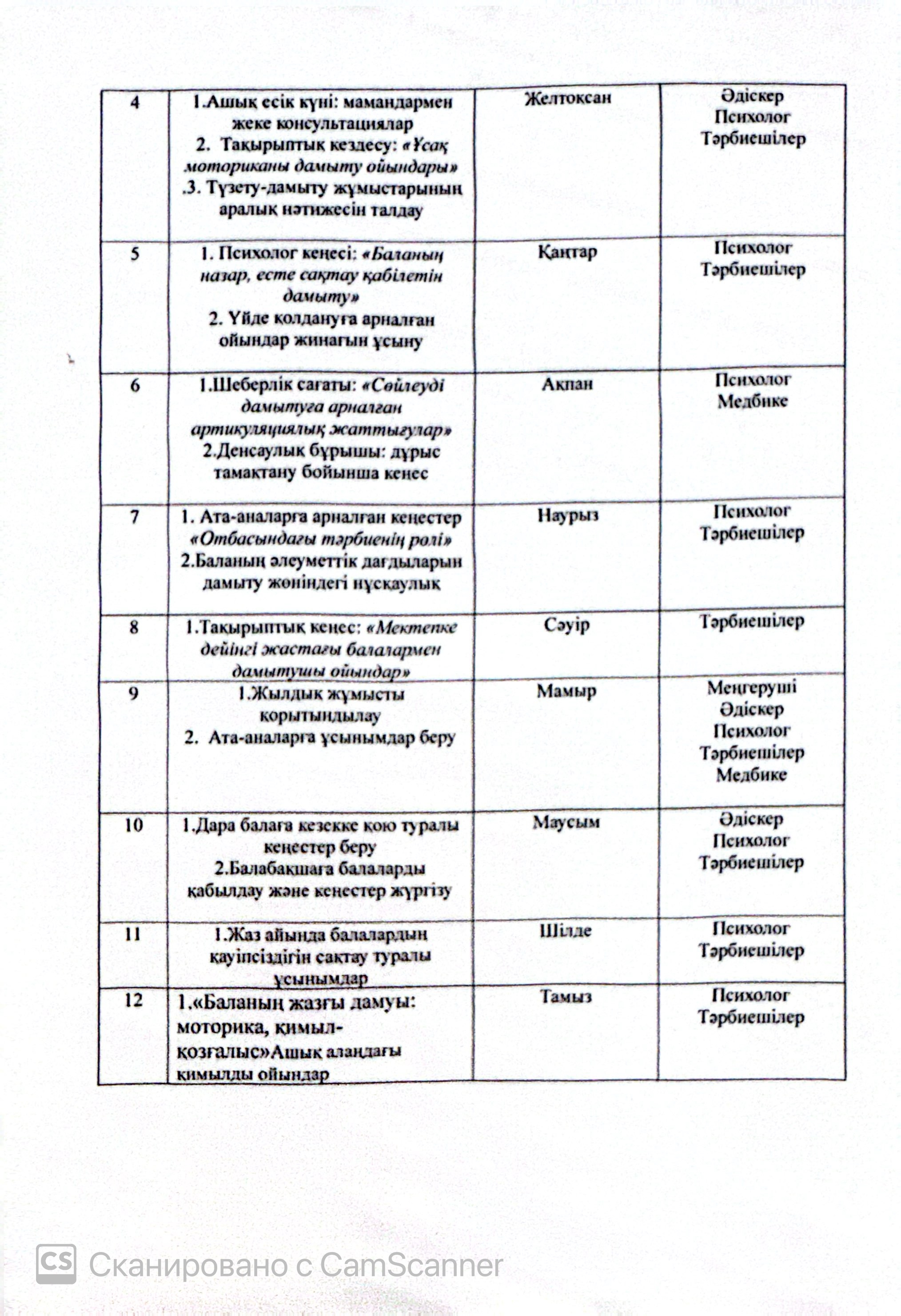 | 3 | Консультативтік пункт мамандарының жұмыс |